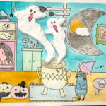 オランダの画家ゴッホの代表作「星月夜」を模倣して、ハロウィーンの夜のお化けを描きました。